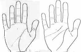 생명선은 식지(검지손가락)와 엄지의 기저부 중간에서 시작됩니다. 식지 쪽에 가까우면 우월감이 강하고 리더십이 있는 성격을 나타내며, 엄지 쪽에 가까우면 성격이 충동적이고 사람들과 자주 다툼을 일으키는 경향이 있습니다. 아래 왼쪽 그림은 생명선이 식지 쪽에 가까운 경우, 오른쪽 그림은 엄지 쪽에 가까운 경우입니다.