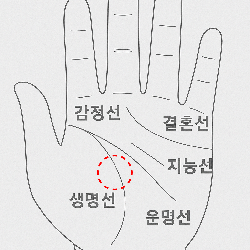 생명선은 엄지손가락 둘레를 감싸듯 손바닥 아래쪽을 따라 흐르는 곡선입니다. 보통 사람들은 생명선이 길수록 오래 산다고 생각하지만, 그보다는 ‘건강상태’, ‘체력’, ‘활력’ 등을 나타내는 경우가 많아요. 선이 굵고 선명하면 건강하고 에너지가 넘치며, 끊기거나 흐릿하면 스트레스가 많거나 면역력이 떨어져 있을 수 있답니다.