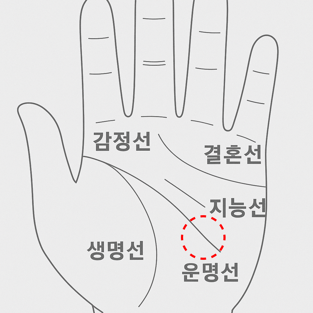 운명선은 손바닥 아래 중앙에서 시작해 중지 방향으로 수직으로 올라가는 선입니다. 인생의 흐름, 직업운, 외부 환경의 영향을 나타내며, 진로 변경, 이직, 전환점 등의 계기를 알 수 있어요. 선이 선명하고 길면 목표 지향적이며 인생의 흐름이 뚜렷한 사람으로 해석돼요.