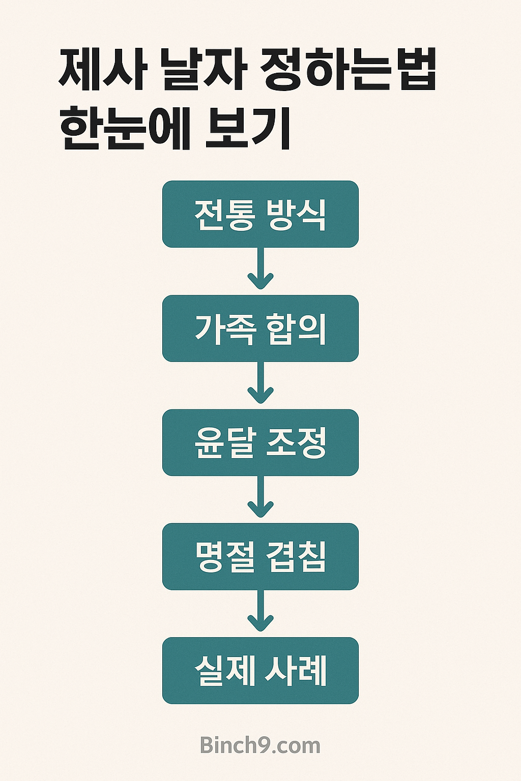 인포그래픽 제안: ‘제사 날짜 정하는법 한눈에 보기’ – 전통 방식 ▶ 가족 합의 ▶ 윤달 조정 ▶ 명절 겹침 ▶ 실제 사례 흐름도