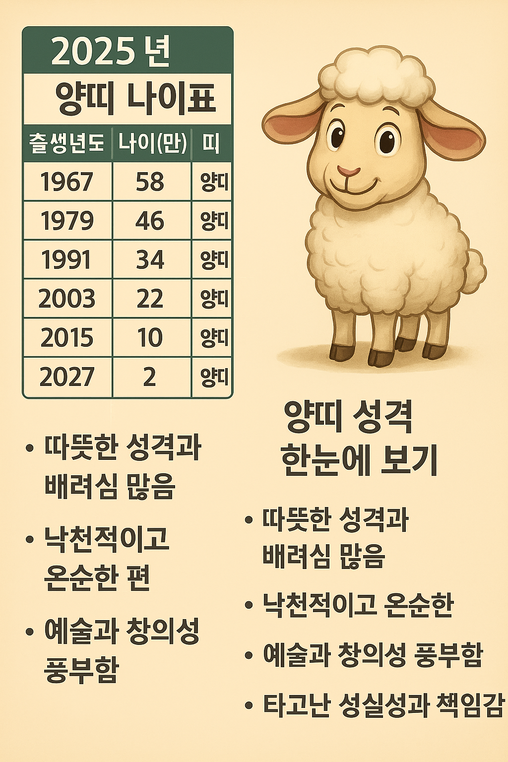 양띠 나이는 2025년 기준으로 출생년도별로 다르며, 성격은 온화하고 따뜻하며 성실한 성향이 강한 편입니다.