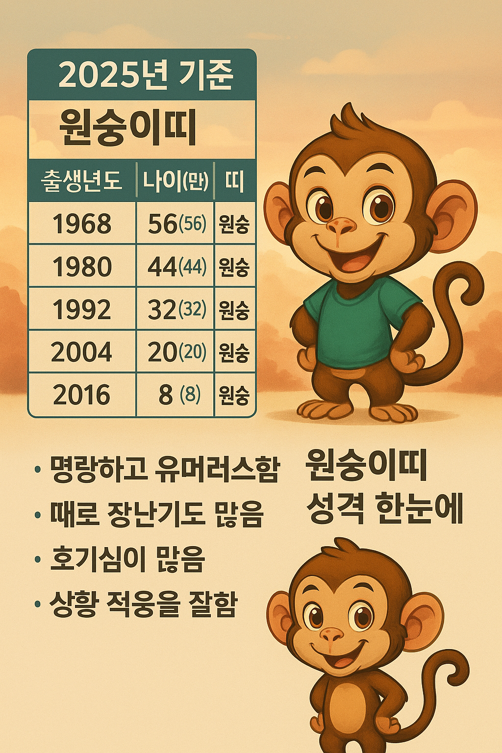 원숭이띠 나이는 2025년 기준으로 출생년도별로 다르며, 성격은 재치 있고 활발하며 긍정적인 에너지가 강한 편입니다.