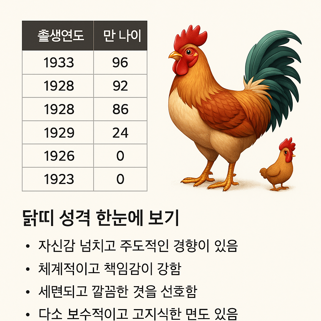 닭띠 나이는 2025년 기준으로 출생년도별로 다르며, 성격은 성실하고 체계적이며 책임감이 강한 편입니다.